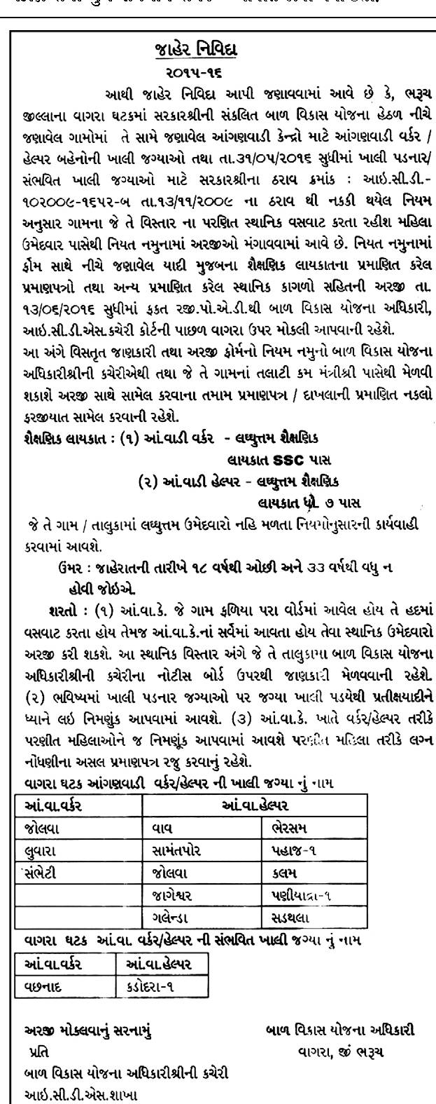 Recruitment @ ICDS - Bharuch Recruitment 2016 for Anganwadi worker | Helper Posts 2016.